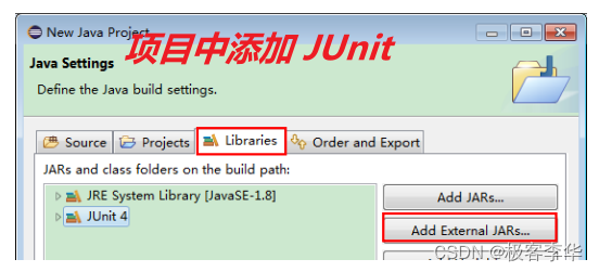 在“Libraries”选项卡中单击“Add Library…”,选择“JUnit”,然后单击“Next”,选择 版本“JUnit4”,单击“Finish”,完成 JUnit 的引入。