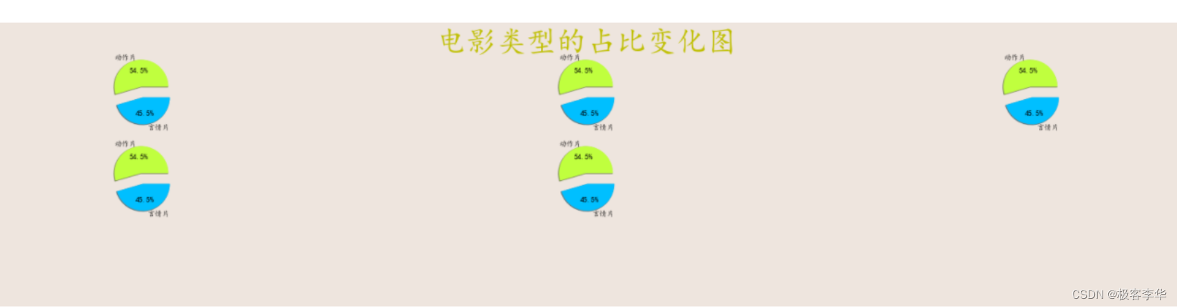 plt.title('电影类型的占比变化图',fontsize=40,color='y') # 设置图的标题, 默认居中,