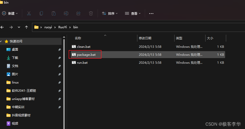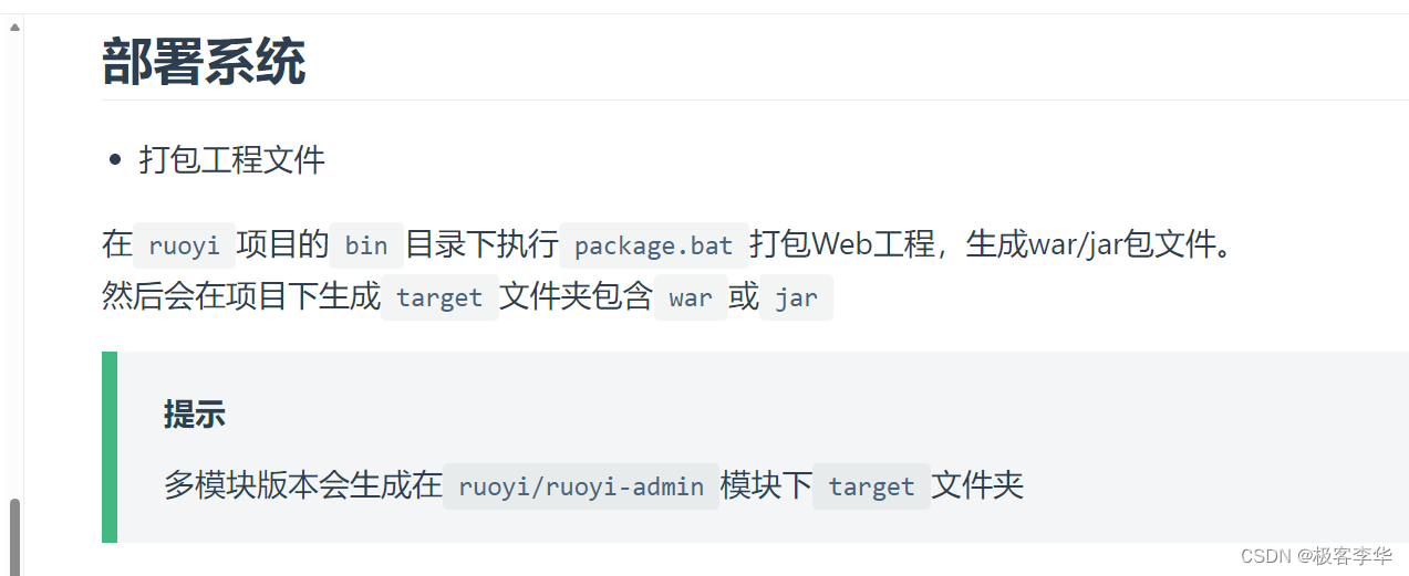 打包工程文件 在ruoyi项目的bin目录下执行package.bat打包Web工程,生成war/jar包文件。 然后会在项目下生成target文件夹包含war或jar。