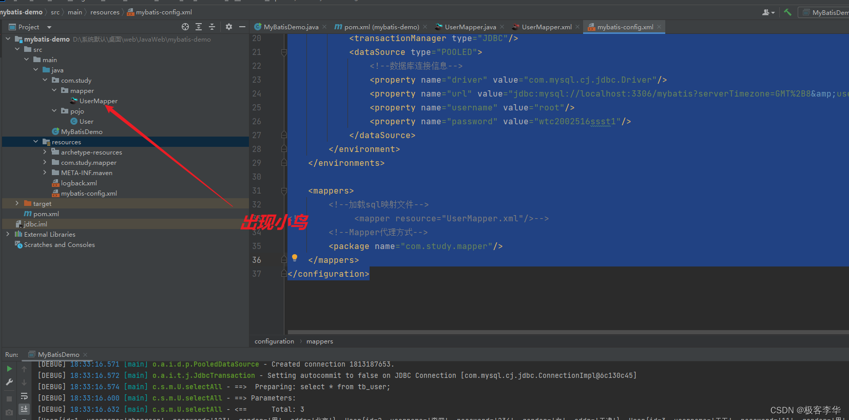 在 test/java 下的 com.study.mapper 包下的 MybatisTest类中 定义测试方法