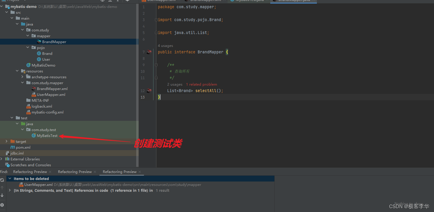}在 com.study.mapper 包写创建名为 BrandMapper 的接口。并在该接口中定义 List<Brand> selectAll() 方法。