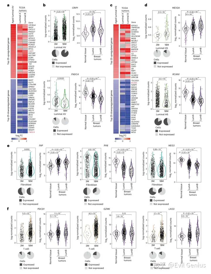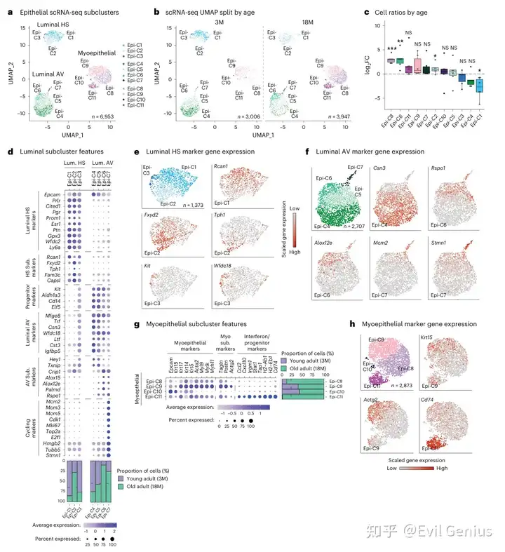 总体而言,80%、71%和82%的与年龄相关的差异表达(DE)基因分别在管腔AV、管腔HS和肌上皮细胞中具有细胞类型特异性。