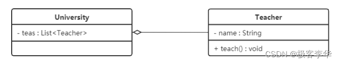 聚合关系的特点是,成员可以脱离于整体对象独立存在,比如学校与老师的关系,学校包含老师,但是就算学校没了,老师依然可以存在。