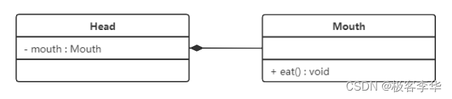 类图中,组合关系用带实心菱形的实线来表示,菱形指向整体。下图所示是头和嘴的关系图:
