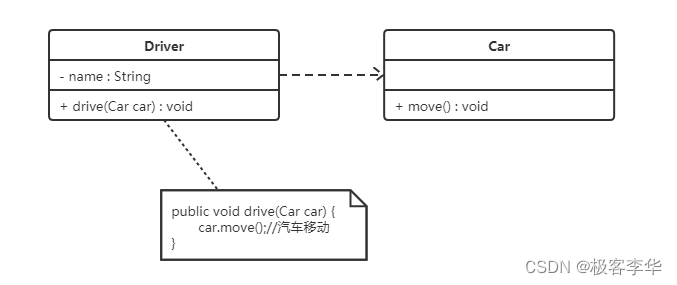 类图中,依赖关系使用带箭头的虚线来表示,箭头从使用类指向被依赖的类。下图所示是司机和汽车的关系图,司机驾驶汽车: