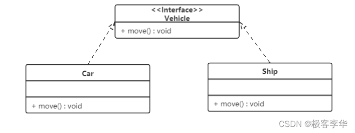 来表示,箭头从实现类指向接口。例如,汽车和船