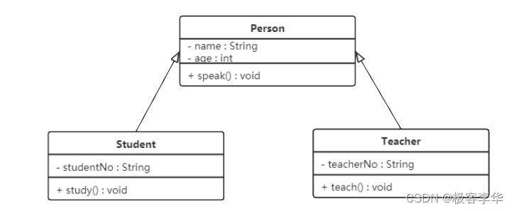 来表示,箭头从子类指向父类。在代码实现时,使用面向对象的继承机制来实现泛化关系。例如,Student 类和 Teacher 类都是 Person 类的子类,其类图如下图所示: