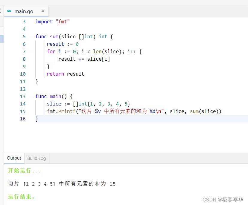 fmt.Printf("切片 %v 中所有元素的和为 %d\n", slice, sum(slice))