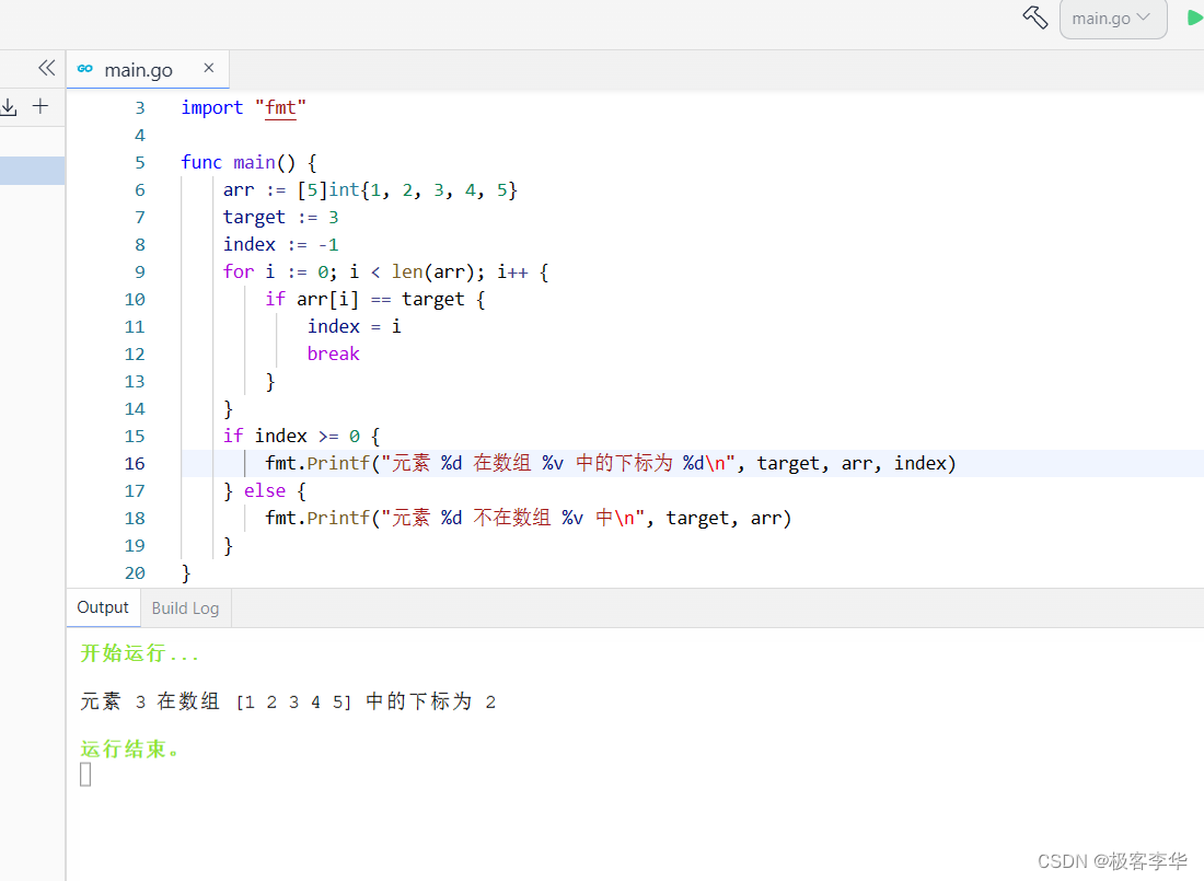 fmt.Printf("元素 %d 在数组 %v 中的下标为 %d\n", target, arr, index)