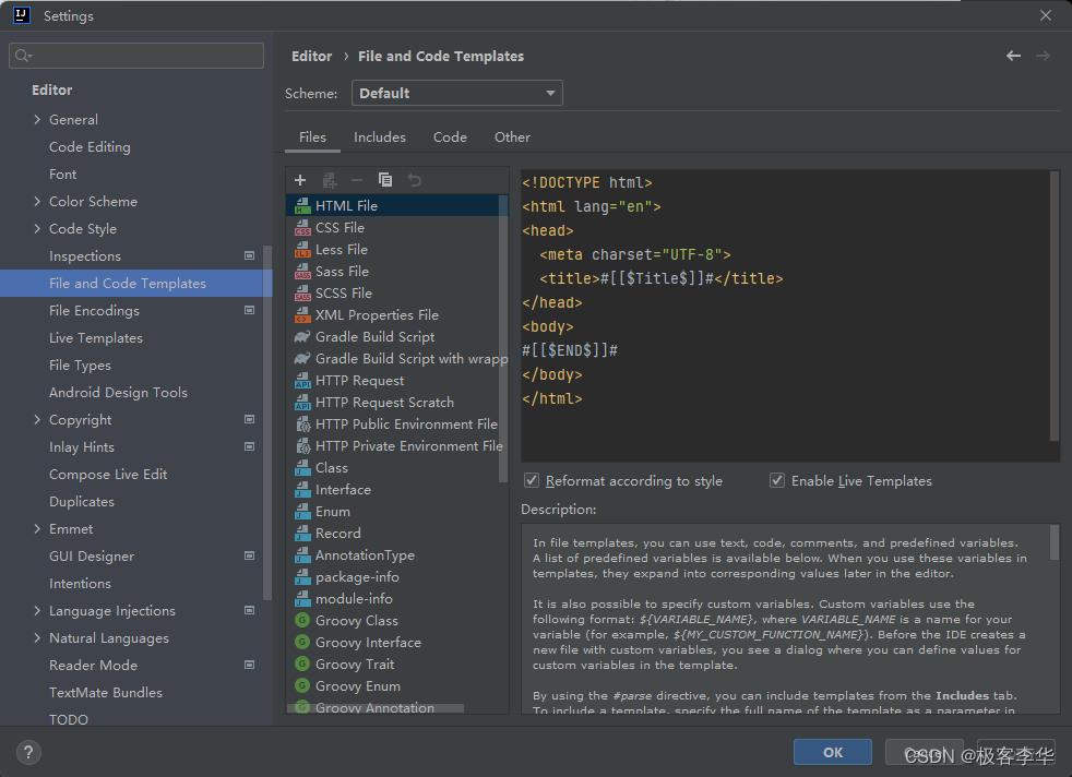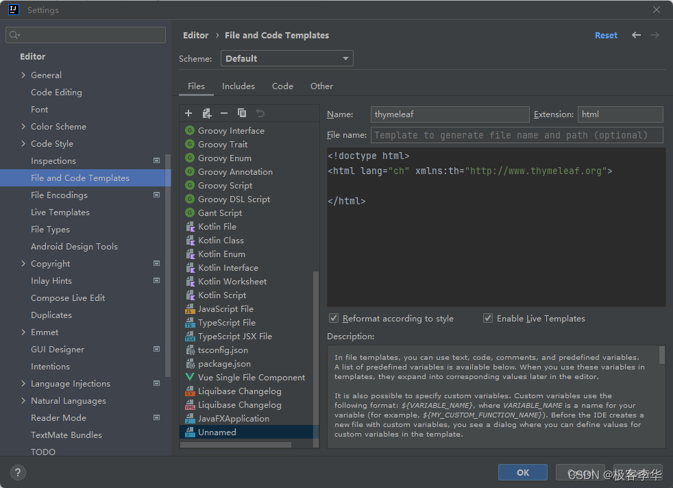 再setting的Editor中的File and code Templates中创建,thymeleaf模板,方便以后的调用。