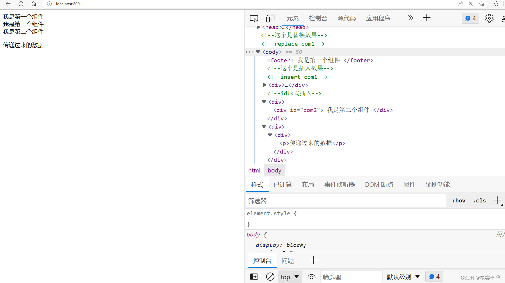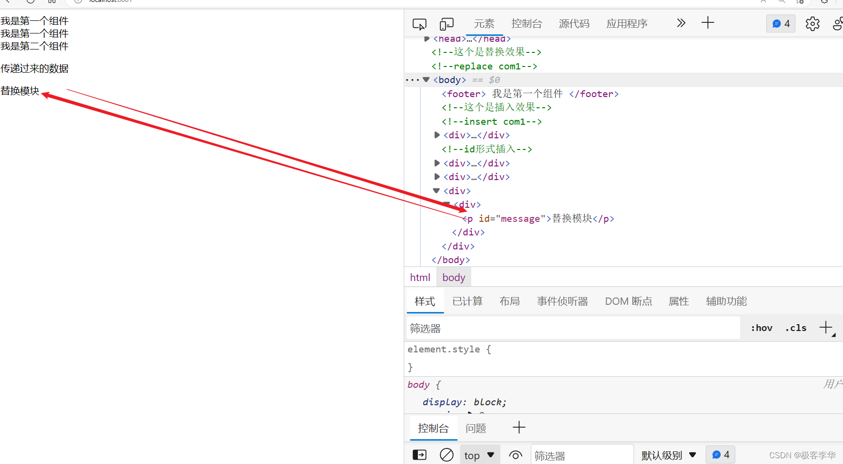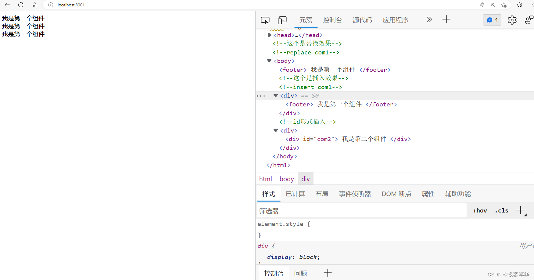 运行结果 从结果可以看出来,第一个是采取的replace的方式,这个方式之下,是直接用组件的内容,替换原来位子的内容的,然后另一个是insert的方式,在这个方式之下,是在原来的组件的前提之下,内部插入一个组件,然后还有一个id的方式,效果和第一个差不多。