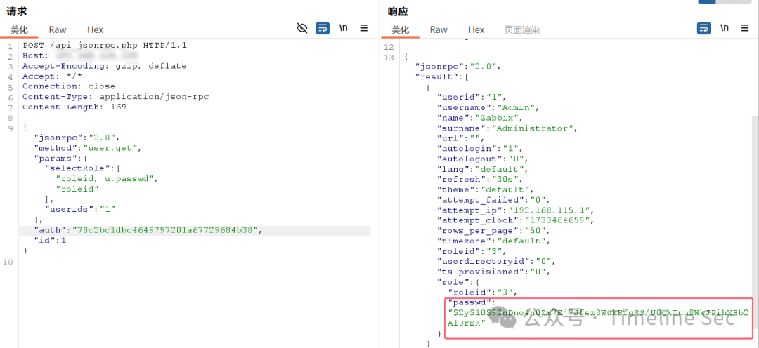 {"jsonrpc": "2.0", "method": "user.get", "params": {"selectRole": ["roleid, u.passwd", "roleid"], "userids": "1"}, "auth": "78c2bc1dbc4649797201a67729684b38", "id": 1}