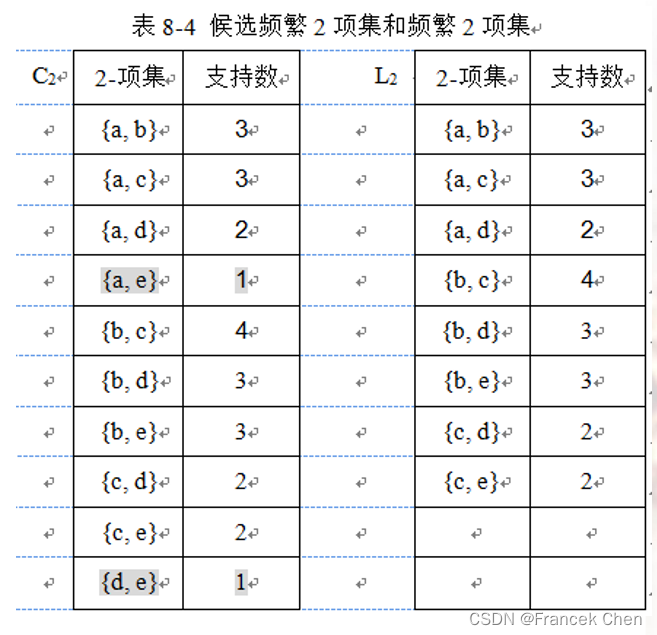 :删除支持数小于等于2的候选2-项集,最终得到所有的频繁2-项集。