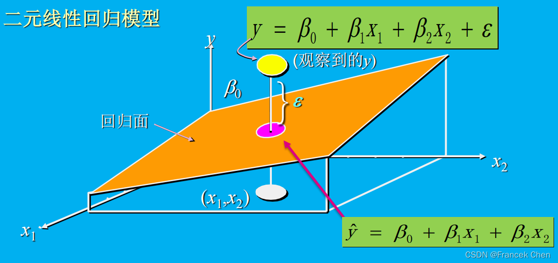 一元线性回归由大体上有线性关系的一个自变量和一个因变量组成;模型是