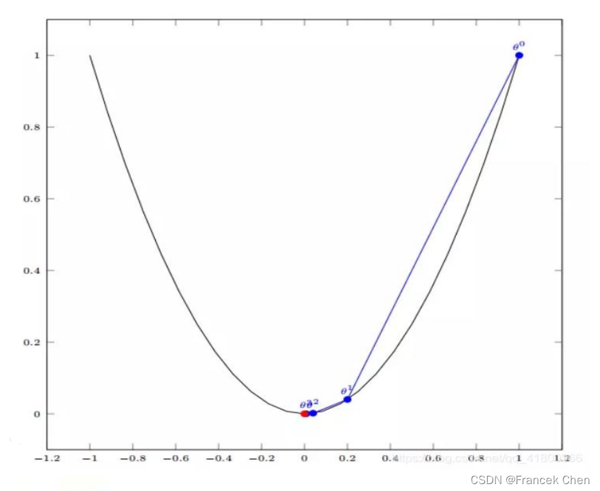 \alpha=0.4θ^0=1θ^1=θ^0-α\cdot J'(θ^0)=1-0.4\times2=0.2θ^2=θ^1-α\cdot J'(θ^1)=0.2-0.4\times0.4=0.04θ^3=θ^2-α\cdot J'(θ^2)=0.04-0.4\times0.08=0.008θ^4=θ^3-α\cdot J'(θ^3)=0.008-0.4\times0.016=0.0016梯度下降法举例(2):