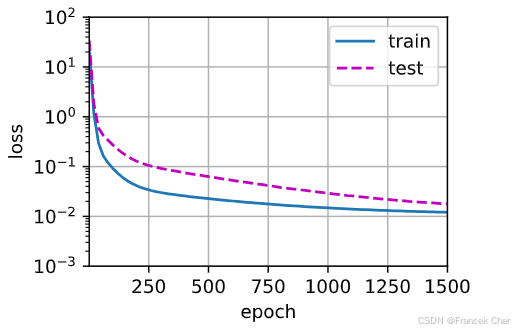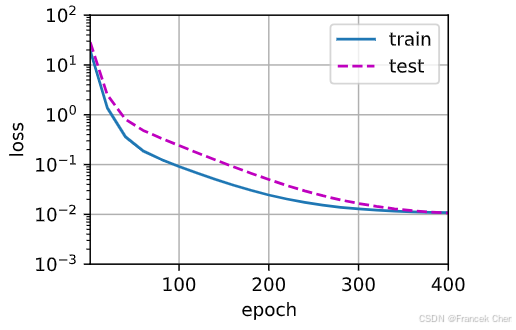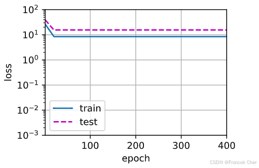 现在,让我们尝试使用一个阶数过高的多项式来训练模型。在这种情况下,没有足够的数据用于学到高阶系数应该具有接近于零的值。因此,这个过于复杂的模型会轻易受到训练数据中噪声的影响。虽然训练损失可以有效地降低,但测试损失仍然很高。结果表明,复杂模型对数据造成了过拟合。