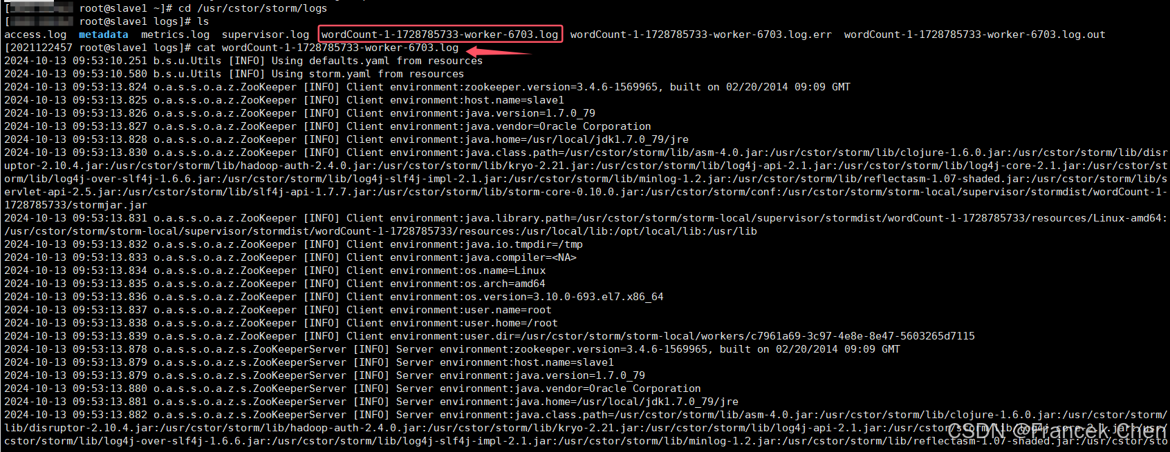 Storm 任务执行时,可以查看 Storm 日志文件,日志里面打印了统计的单词结果,日志内容如图。注意要到 slave1 服务器上查看日志文件。