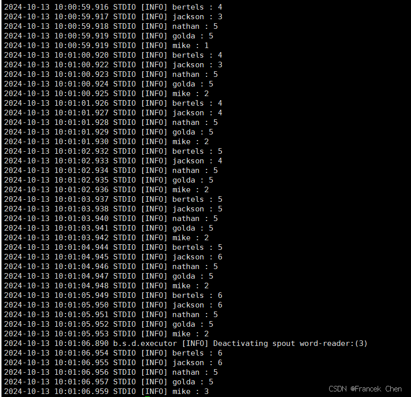 编写一个 Storm 拓扑,一个 Spout 每个一秒钟随机生成一个单词并发射给 Bolt,Bolt 统计接收到的每个单词出现的频率并每隔一秒钟实时打印一次统计结果,最后将任务提交到集群运行,并通过日志查看任务运行结果。