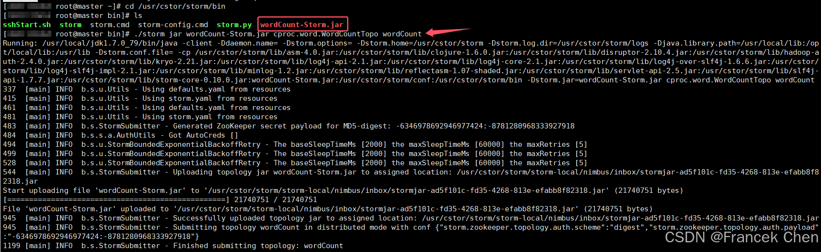 中只包含上面三个类的代码) 上传到主节点的/usr/cstor/storm/bin