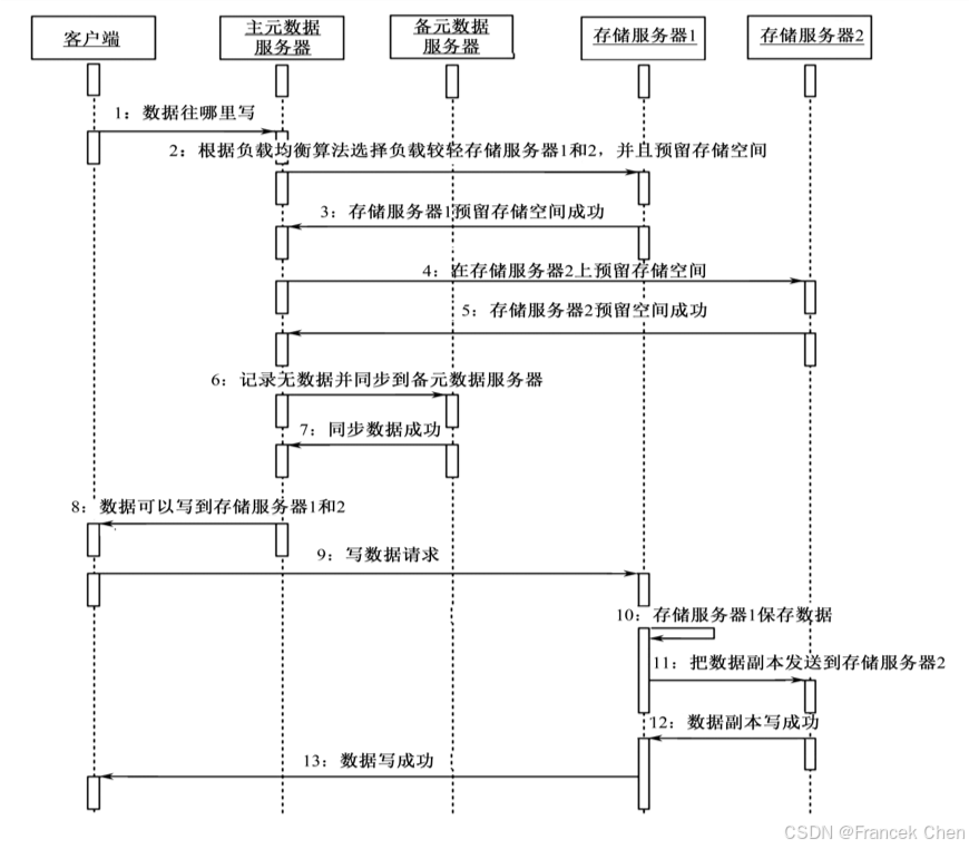 详细过程如下: (1)cStor客户端向元数据服务器发起数据写请求 (2)元数据服务器根据存储服务器的负载情况,选择负载较轻的存储服务器1和存储服务器2存储数据的两个副本,在存储服务器1上预留存储空间保存数据 (3)存储服务器1存储空间足够,向元数据服务器返回预留存储空间成功 (4)元数据服务器同时向存储服务器2发起预留存储空间申请 (5)存储服务器2存储空间足够,向元数据服务器返回预留存储空间成功 (6)主元数据服务器同步元数据信息到备元数据服务器,保证元数据始终保存两份 (7)同步元数据成功 (8)元数据服务器向客户端返回数据可以写到存储服务器1和2 (9)客户端向存储服务器1发起数据请求 (10)存储服务器1保存数据 (11)存储服务器1同时把数据副本发送到存储服务器2,存储服务器2保存数据副本 (12)存储服务器2副本写成功,返回写成功给存储服务器1 (13)客户端收到成功信号后,即完成数据的存储