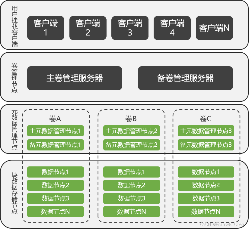 cStor云存储文件系统采用分布式的存储机制,将数据分散存储在多台独立的存储服务器上。它是由卷管理服务器 (VolumeServer),元数据管理服务器 (MasterServer) 和数据存储服务器 (ChunkServer) 以及客户端组成,对外提供一个虚拟的海量存储卷。如图所示。 其中,MasterServer保存系统的元数据,负责对整个文件系统的管理,MasterServer在逻辑上只有一个,但采用主备双机镜像的方式,保证系统的不间断服务;ChunkServer负责具体的数据存储工作,数据以文件的形式存储在ChunkServer上,ChunkServer的个数可以有多个,它的数目直接决定了cStor云存储系统的规模;客户端即为服务器对外提供数据存储和访问服务的窗口,通常情况下,客户端都部署在ChunkServer上,每个块数据服务器、及时存储服务器也是客户端服务器。对每个节点,cStor云存储系统提供的管理监控中心都可以对其进行管理,包括设备运行状态、磁盘运行状态、服务在线情况以及异常告警等功能。另外,网管监控中心还提供FTP账户添加等客户端管理和配置工具。