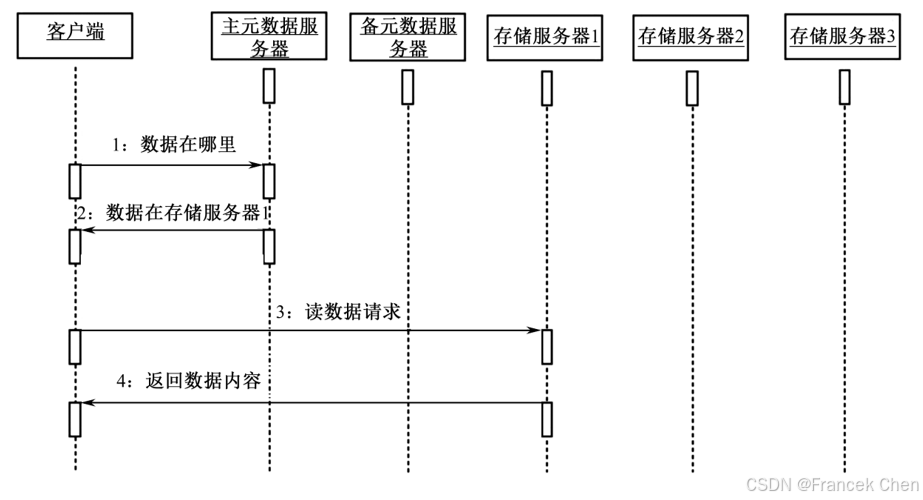 详细过程如下: (1)cStor客户端向元数服务器发起数据读请求 (2)元数据服务器查找文件保存在存储服务器1上,然后告知客户端 (3)客户端存储服务器1发出数据读请求,并从存储服务器1读取数据 (4)存储服务器1返回数据内容给客户端