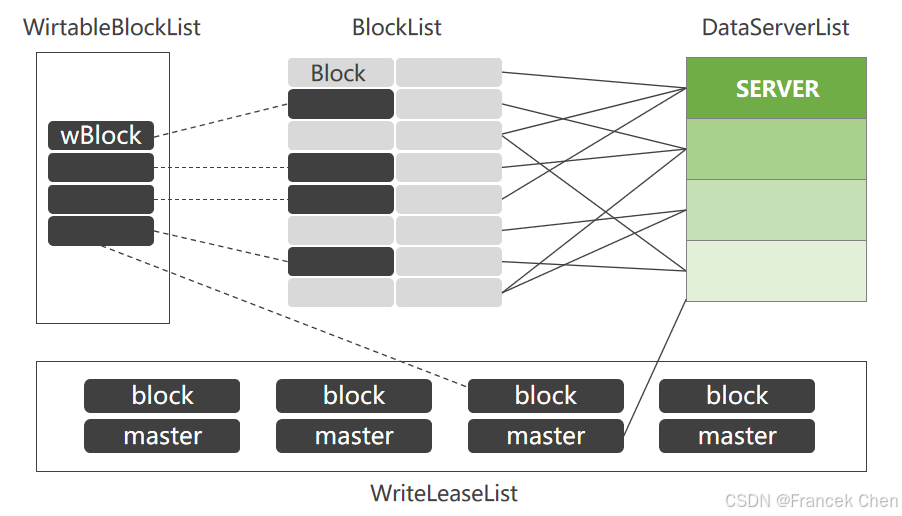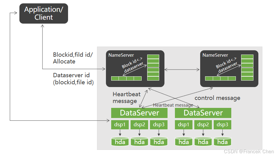 NamServer负责维护Block列表和DataServer与Block之间的关系。 NameServer和DataServer之间也会有定时的heartbeat。