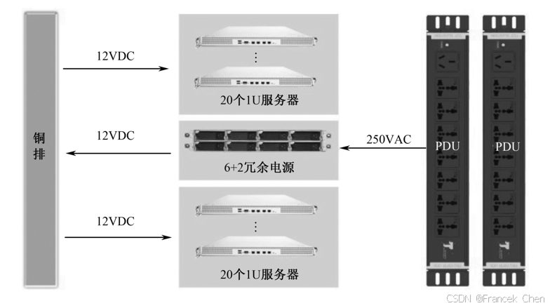 A8000采用集中式供电系统,通过8个1800W的电源模块,构成6+2的冗余系统,任意一个电源模块出现故障,不影响整个系统的供电。 A8000采用目前最先进的直流式供电(12V),电压从250VAC直接逆变到12VDC,通过铜排电缆送到每个节点,减少电压逆变次数,提高电源效率。如图所示。