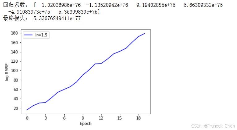 然而,算法的RMSE随着迭代不但没有减小,反而发散了。注意,由于原始的损失数值过大,我们将纵轴改为了损失的对数,因此图中的直线对应于实际的指数增长。上图最后的损失约为
