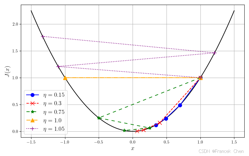 可以看出,随着学习率增大,算法的收敛速度明显加快。那么,学习率是不是越大越好呢?我们将学习率继续上调到1.5观察结果。