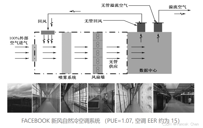 使用室外自然冷风直接带走机房的IT设备的散热,减少了机械制冷系统中最大的压缩耗能环节,压缩机制冷系统的EER由2~3.5提高到10~15,节能空间巨大。