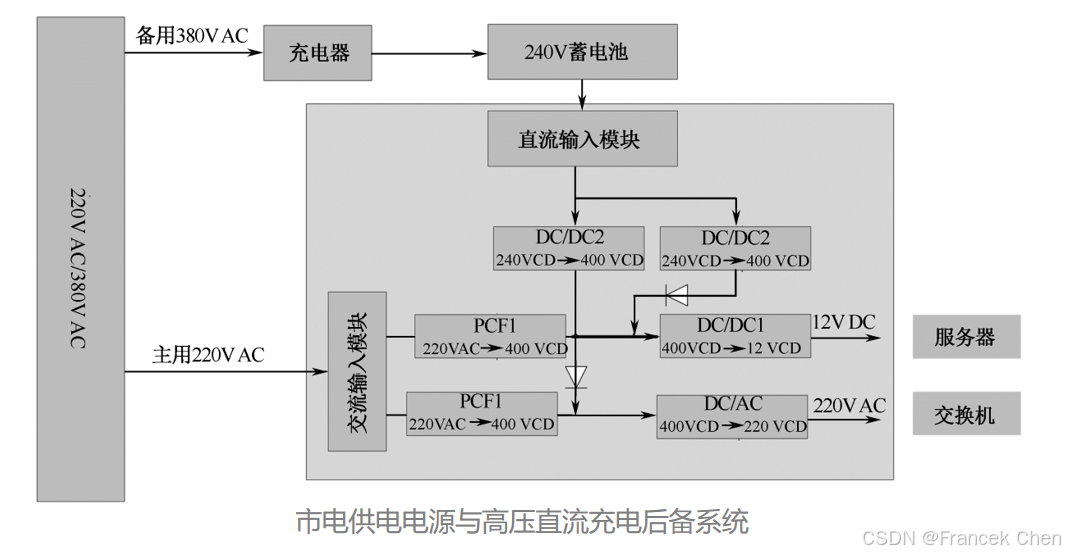 在市电正常时,交流输入模块经过一级直流PFC电路将220V交流电升高到400V的直流电,再经过降压变换电路将400V的直流转换成12V的直流供给服务器主板,逆变模块将400V直流转换为220V交流供给交换机使用。在市电异常时,由240V的蓄电池供电,直流输入模块经过一级升压电路将240V直流升至400V直流,再经过降压变换电路将400V的直流转换成12V的直流供给服务器主板,逆变模块将400V直流转换为220V交流供给交换机使用。当市电恢复正常或油机启动后电源会自动由蓄电池直流供电切换到交流供电状态,切换由电源模块自身完成,整个过程无缝切换保证了输出不间断。 市电直供电源保留了机架式电源支持热插拔的模块化设计,也采用机架分散供电的方式,同样适合云数据中心的特点,即模块化扩容、高效率、高可用性和高可维护性。 采用市电直供方案,其最大的特点在于最大化减少配电系统的转换环节,从市电到服务器12V主板只经过两级电路转换,整个配电系统的综合效率能够达到92%左右,与传统数据中心配电和高压直流配电技术相比,具有较为明显的优势。