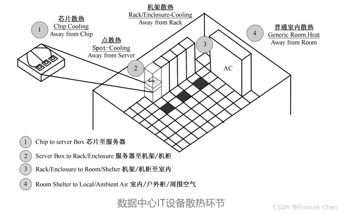 在数据中心运行过程中,服务器节点、网络设备、办公环境等时刻产生着热量,如果不能及时散发热量,数据中心将无法运行。数据中心常见散热环节如图所示。 空调系统是目前大部分数据中心必须具备的基础设施,它能够保证数据中心具备合适的温湿度,从而保障数据中心IT设施平稳运行,避免发生故障或损坏设备。同时, 由于空调系统自身也需要消耗电力,因此如何提高空调系统运行效率,甚至如何使用自然冷空调系统,成为数据中心节能方面一个热点话题。 在传统数据中心里,空调系统主要针对机房内整体温湿度控制需求,基本方法是先冷却机房环境再冷却IT设备。机房空调的设计流程一般是先核算机房内的建筑负载和IT设备负载,选择机房的温湿度指标,然后再根据机房的状况,匹配一定的气流组织方式 (如风道上送风、地板下送风等)。机房专用空调设备一般会集成制冷系统、加湿系统、除湿系统、电加热系统,同时辅助以复杂的逻辑和控制系统。传统数据中心空调系统效率通常较低,采用指标能效利用系数PUE (Power Usage Effectiveness, PUE=1+ (配电损耗+空调功耗+其他损耗)/IT功耗) 核算,PUE一般在2.0以上,除了使用传统UPS损耗和散热影响外,空调系统就是主要的原因,主要体现在数据中心中冷热通道不分、机架密封不严密造的冷热混流、过度制冷、空调能效比不高、空调气流组织不佳等。