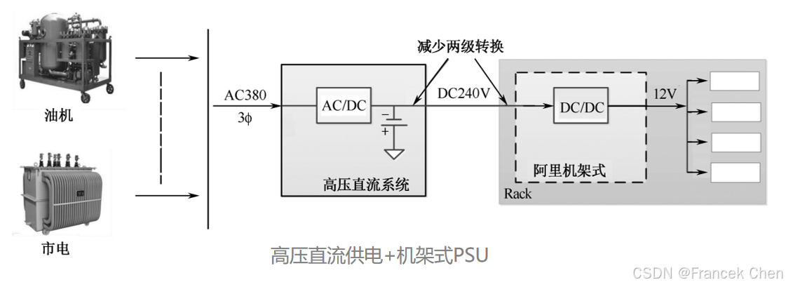 随着将交流电 (如AC380V) 直接转换成240V直流电源 (即高压直流UPS) 技术的出现,目前一些数据中心开始采用240V直流供电架构。由于绝大多数服务器电源模块能够兼容220V交流和240V直流,因此现存服务器节点无须任何修改即可支持。直流电源一般采用模块化设计,而且蓄电池直接挂240V直流母线连接服务器电源无须逆变环节,可靠性也高于交流UPS。另外,240V直流UPS在转换级数上比交流UPS少一级,因此实际运行效率通常在92%以上,再综合240V到12V的直流电压转换,整个配电系统的效率可以提高到约81%。 除此以外,还有一种更加优化的高压直流供电架构。该架构仍然使用240V直流UPS系统,但是将每台服务器节点自身的交流电源模块去除,采用机架集中式电源PSU (Power Supply Unit) 供电。机架式电源能够将240V直流电直接转化为12V直流电,并直接连接至服务器主板。另外,机架电源采用热插拔模块设计,可维护性和更换效率得到提高。机架式电源将传统的集中供电分散到每个机架,可靠性较传统UPS有很大提高,能够更好地适应云计算业务场景。这种架构的配电原理如图所示,由于去除了服务器节点的交流电源系统,因而在效率方面有了更大的提升,在实际测试中,这种配电系统的效率可以提高到85.5%左右。