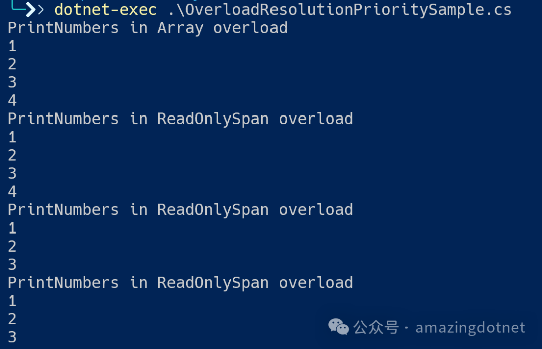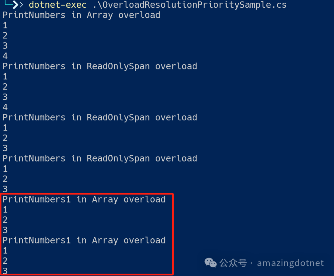 我们来说明一下输出结果,前面两个分别输出了 Array overload 和 ReadOnlySpan overload,因为我们传了具体的类型,所以编译器会优先找类型匹配的重载,所以分别找到了 Array 和 ReadOnlySpan 的方法重载