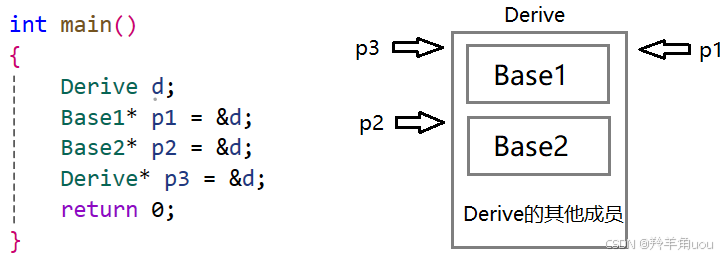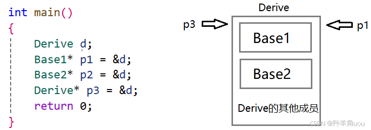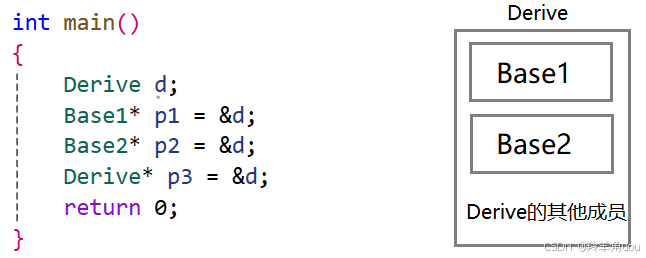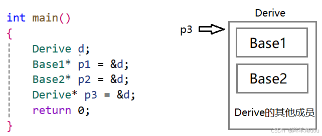 p1是Base1的指针,Base1是基类,p1指向的范围是派生类Derive切出来的Base1的那部分,最开始指向开头,和p3一个位置。