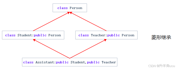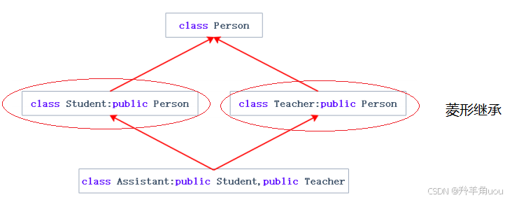 菱形继承有数据冗余和⼆义性(存在歧义)的问题,在Assistant的对象中Person成员会有两份。所以在实践中并不提倡设计出菱形继承的模型。