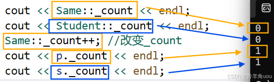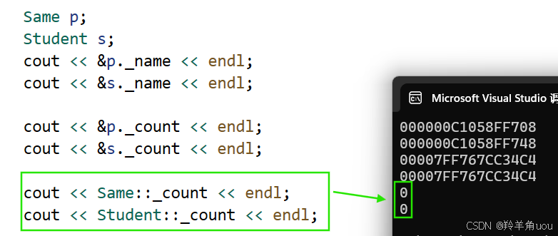 这⾥的运⾏结果可以看到:⾮静态成员_name的地址是不⼀样的,说明派⽣类继承下来了,基类和派⽣类对象各有⼀份;静态成员_count的地址是⼀样的,说明派⽣类和基类共⽤同⼀份静态成员。