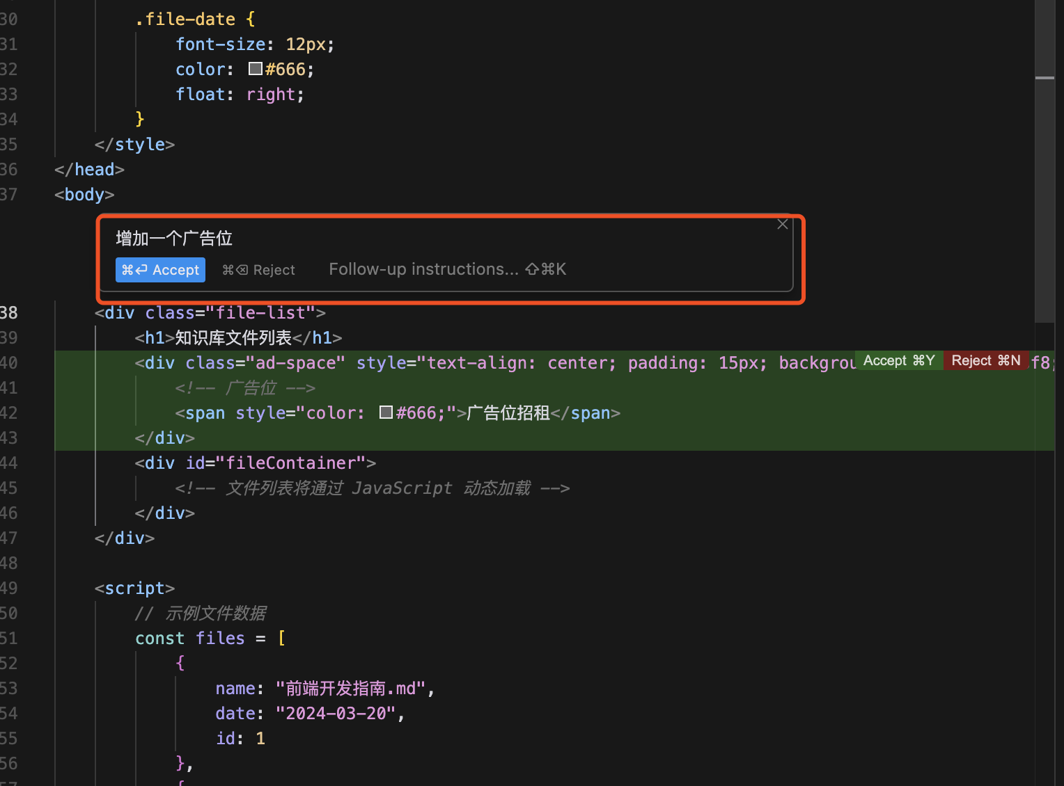 不选中代码的情况下,打开窗口,可以要求AI实现新增的功能,比如这里我想增加一个广告位,效果如下: