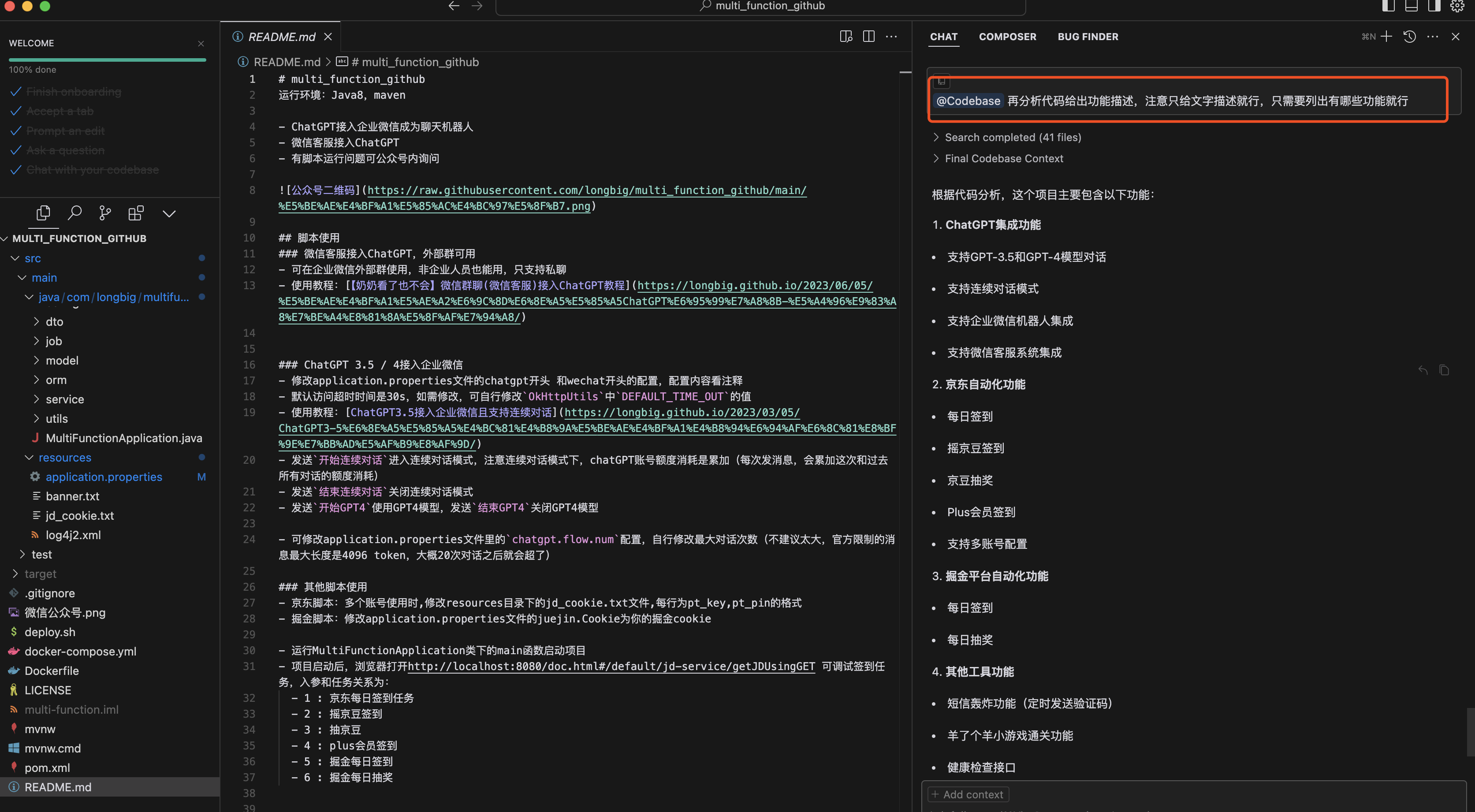 这里在Chat窗口输入@Codebase然后要求AI分析代码功能点,这样即使是旧的,没人维护的项目,我们也能很快理清当前的功能有哪些