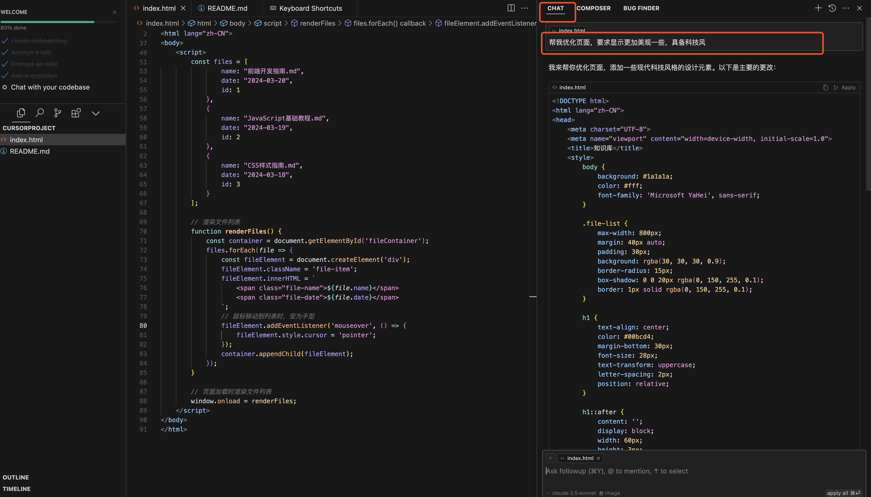 如果只想修改部分代码,可以鼠标选中后,使用Command + K打开窗口,并输入修改要求;