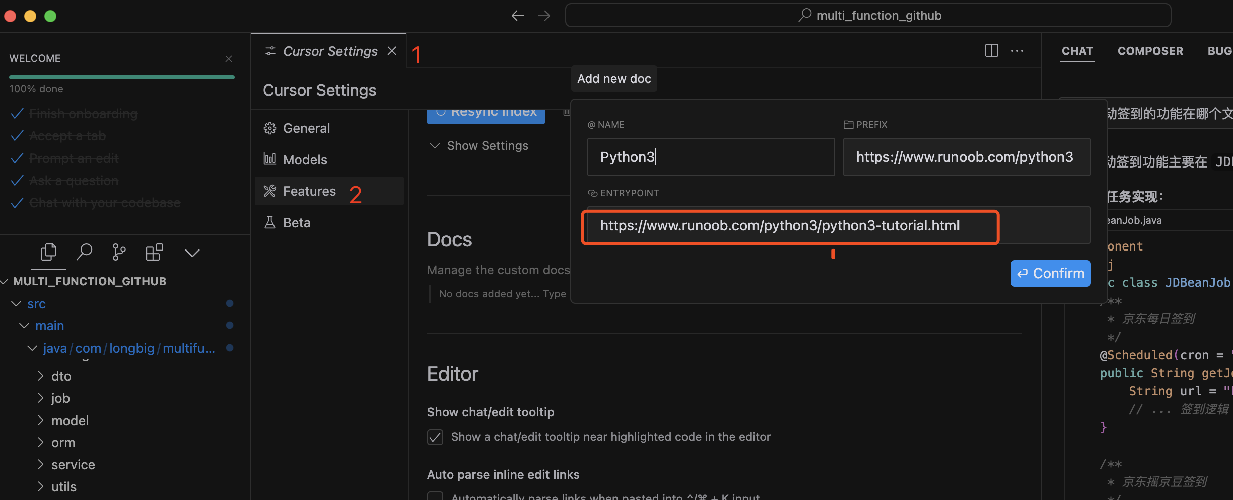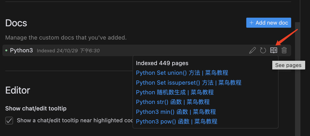 操作方法:在Setting > Cursor Setting > Features设置里,在Docs位置进行配置
