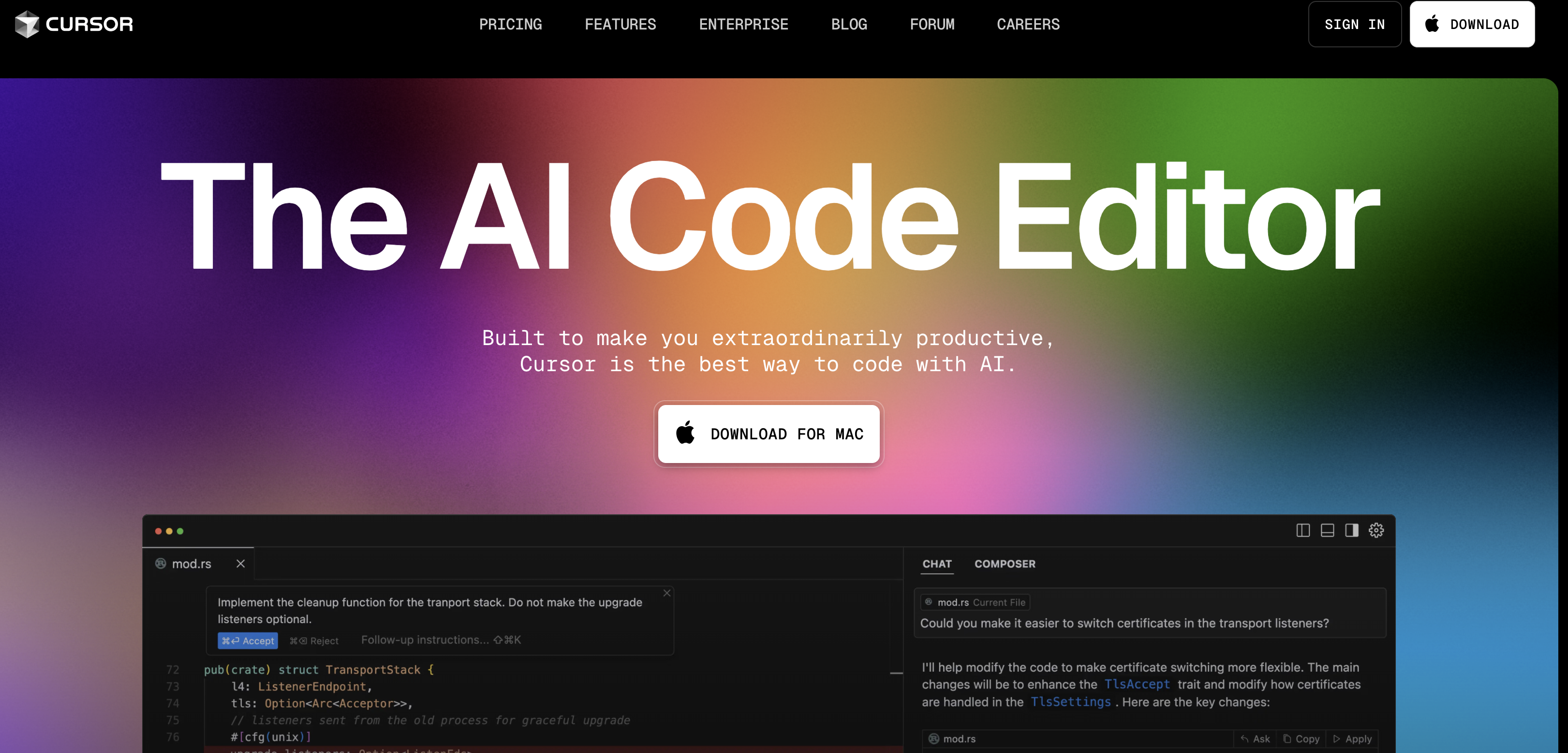 访问Cursor的官网:https://www.cursor.com/ 下载客户端到本地,注册账号时可以选择谷歌邮箱登陆,新注册的账号有14天的Pro版本试用期,足够我们使用了。