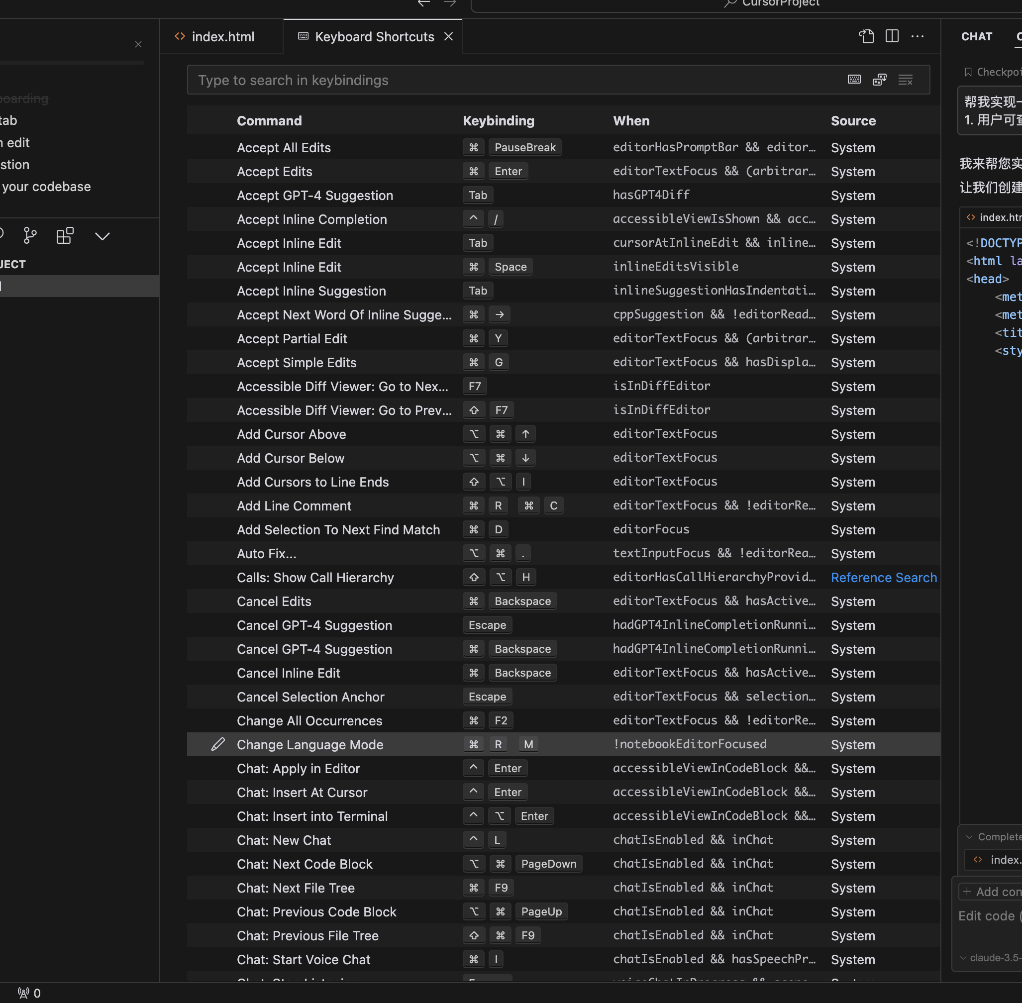Cursor还有一些快捷键的功能,可以自行打开设置里的Keyboard Shortcuts查看