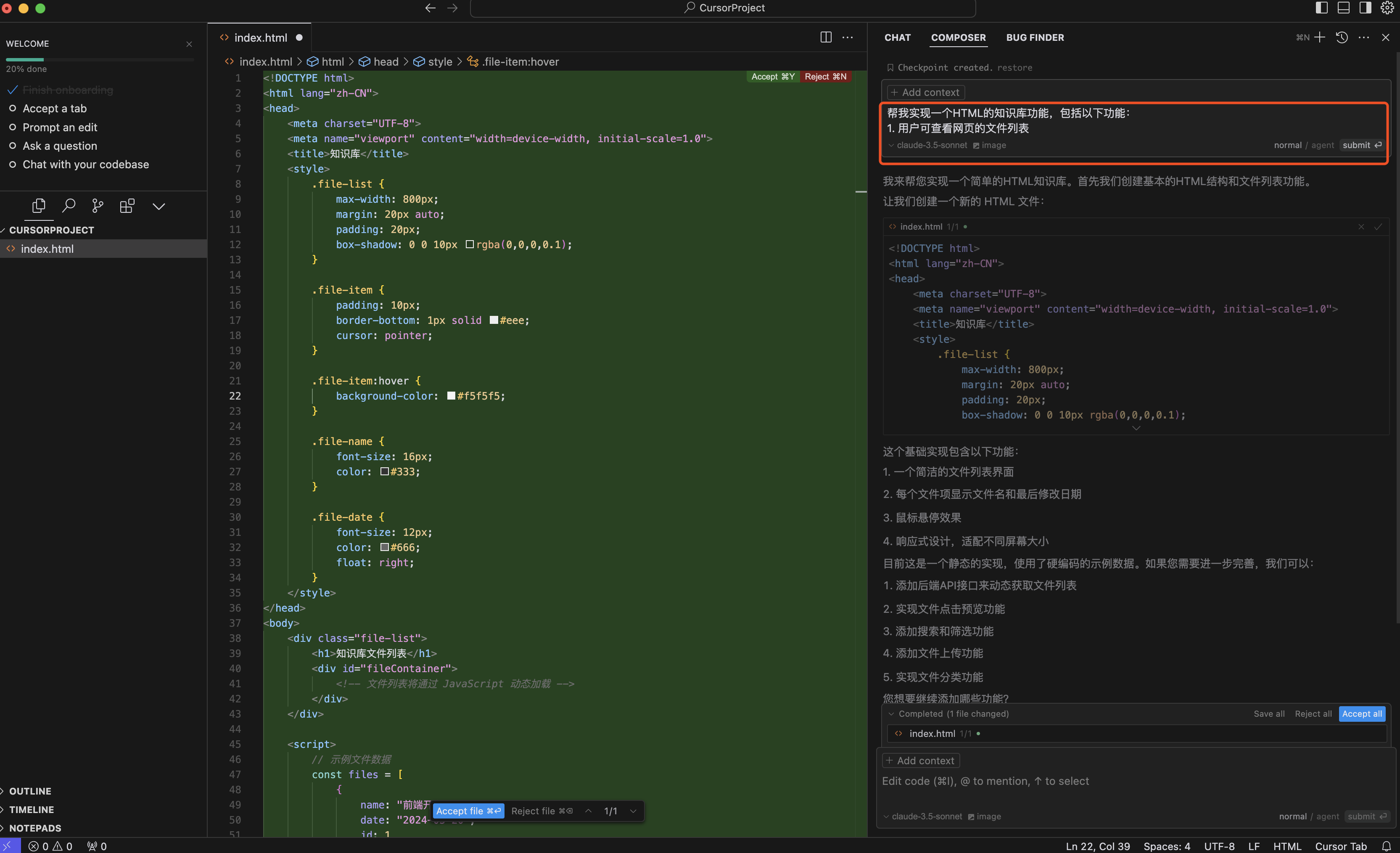 Mac用户使用Command + i 可以唤醒Composer,然后我们输入提示词创建代码结构