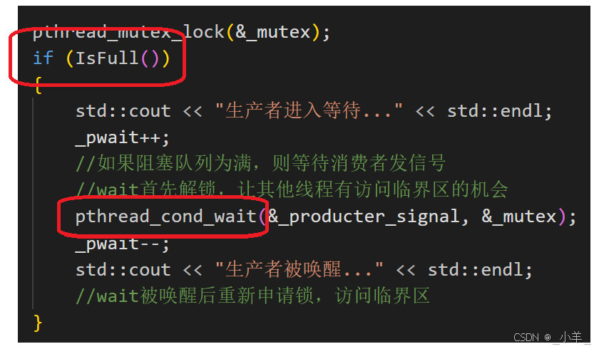 pthread_cond_wait是一个函数,只要是函数就可能会出错,如果这个函数调用出错继续往下执行代码,但是当前阻塞队列中已经满了,再向其中放数据就出错了。还有如果阻塞等待的线程和其他线程所发的信号数量不匹配,也就是出现了伪唤醒,也会出现问题。