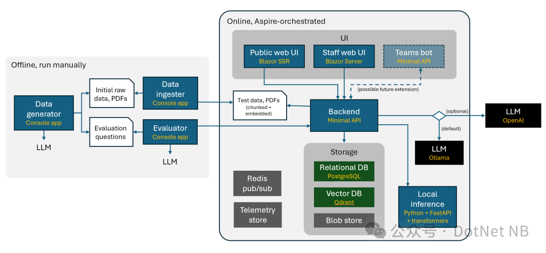 应用程序背后的“大脑”是用于生成响应的大型语言模型 (LLM)。虽然将 LLM 视为聊天或助手是一种普遍趋势,但此示例演示了如何使用它们来增强业务线应用程序中的各种功能。LLM 用于生成摘要、提供问题的答案、建议回复客户查询,甚至生成测试数据。使用 Microsoft.Extensions.AI 提供的标准原语,您可以使用相同的代码与 LLM 交互,无论它是 Ollama 托管的本地模型还是云中的 Azure OpenAI 服务资源。