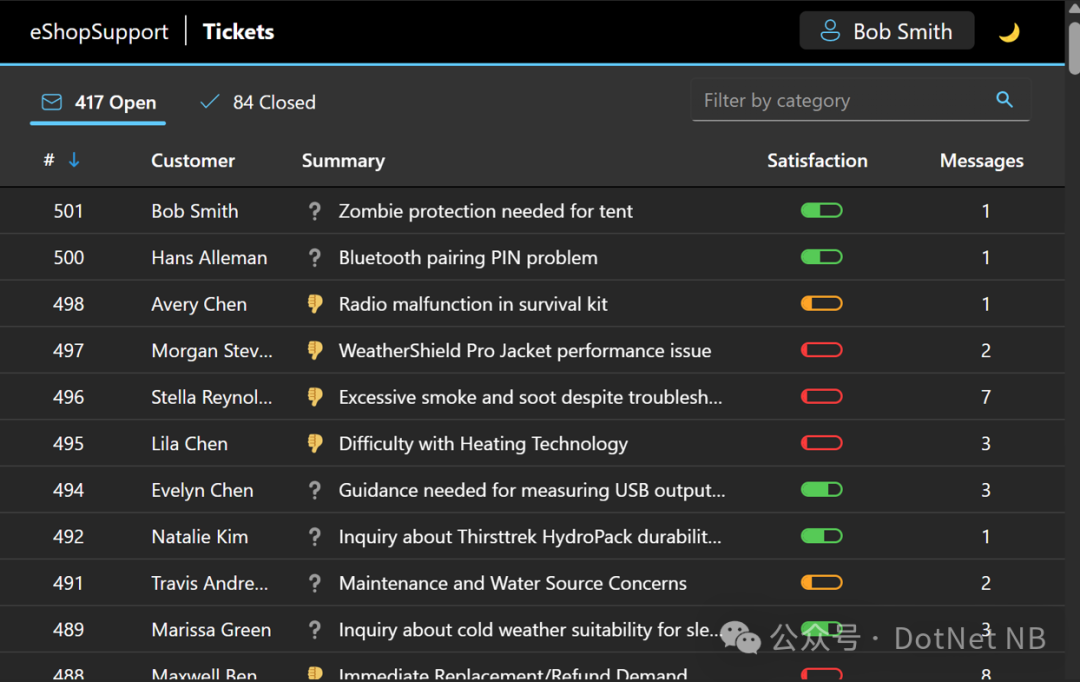 AI 增强型 eShopSupport 应用程序是一个支持站点,客户可使用它来查询产品。eShop 员工有一个工作流程来跟踪这些查询、与客户交谈以及对这些查询进行分类并最终关闭这些查询。通过各种功能,此示例超越了流行的“聊天机器人”场景,说明了 AI 可以提高开发人员工作效率的几种方式,同时提高您能够提供的个性化客户支持水平。