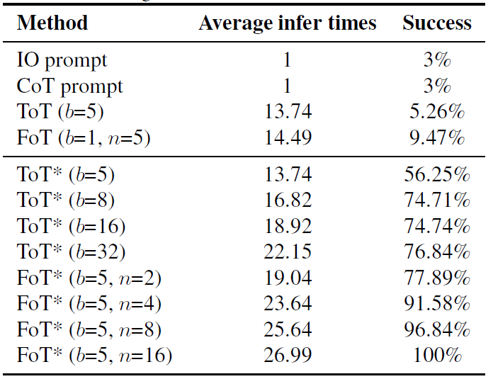 24 点游戏的目标是使用给定的四个数字各一次,通过加、减、乘、除和括号构造一个算术表达式,使其结果为 24。表 1 中的实验结果表明,当推理树的数量从 2 增加到 4 时,FoT 的准确率提高了 14%,显示出显著的推理性能提升。相比之下,仅增加单个树的叶子节点数量的 ToT 方法遇到了性能瓶颈,进一步增加叶子节点数量并未带来显著的性能提升。这表明 FoT 通过多棵树提供的推理路径多样性比单纯增加单个树的复杂性更有效,凸显了 FoT 框架在实现可扩展和高效推理改进方面的优势。