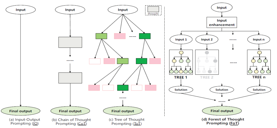图 1 中的 FoT 框架通过整合多个推理树,利用集体决策的优势来解决复杂的逻辑推理任务。它采用稀疏激活策略,选择最相关的推理路径,从而提高模型的效率和准确性。此外,FoT 还引入了动态自校正策略,使模型能够在推理过程中实时识别和纠正错误,并从过去的错误中学习。共识引导决策策略也被纳入其中,以优化正确性和计算资源的使用。